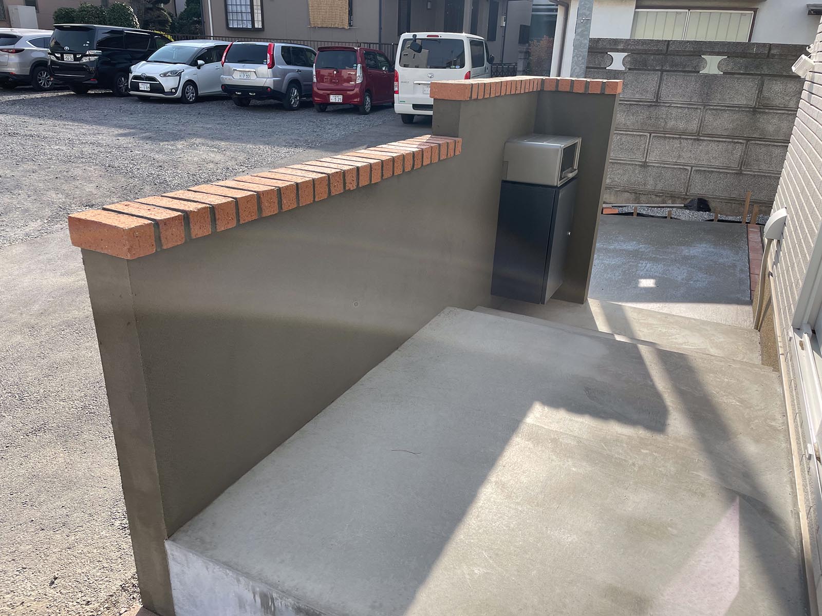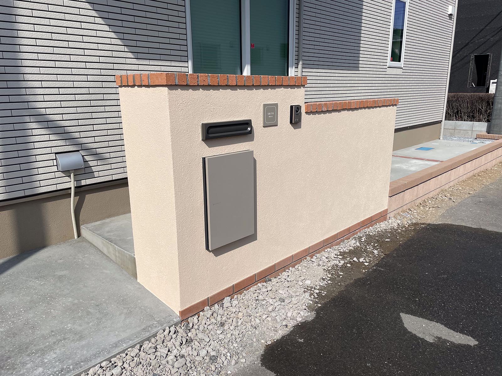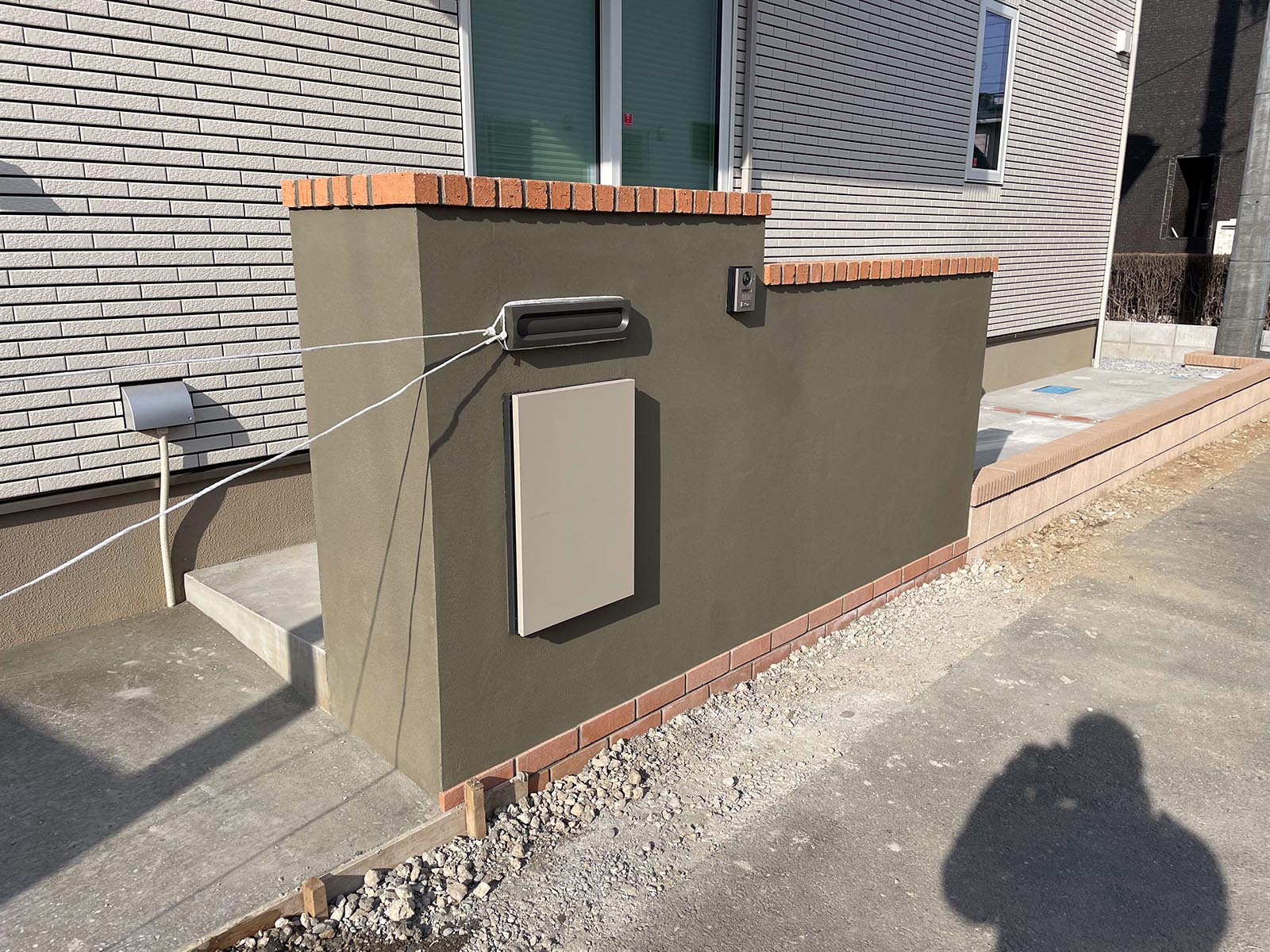 外構屋さんからの依頼でブロック面に軽量モルタルを塗り割れ止めメッシュを全面に伏せ込み、後日ジョリパットを施工させていただきました。レンガの色とあったかわいらしいい門塀になりました。
