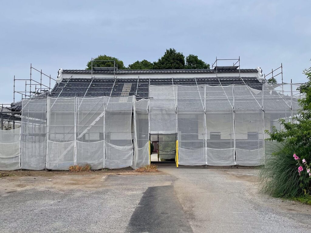 屋根漆喰が痛んでいたので、古いものを全部剝がして下地から綺麗にしました。白い屋根漆喰・影盛りが長屋門・燻し瓦を引き立てています。