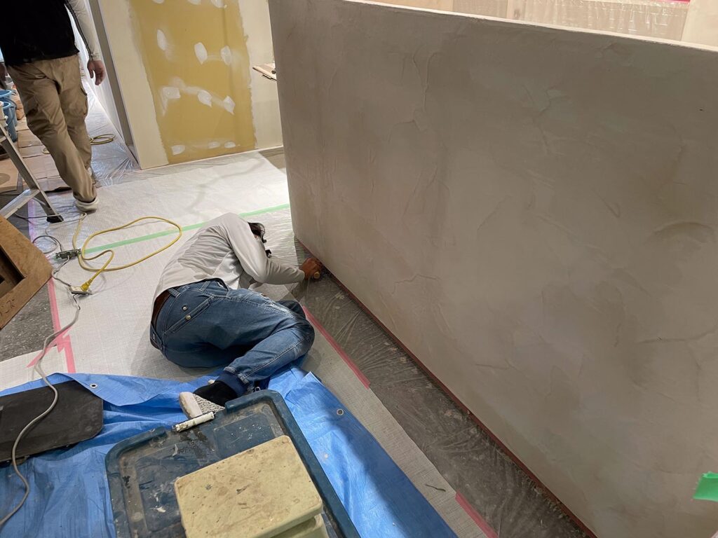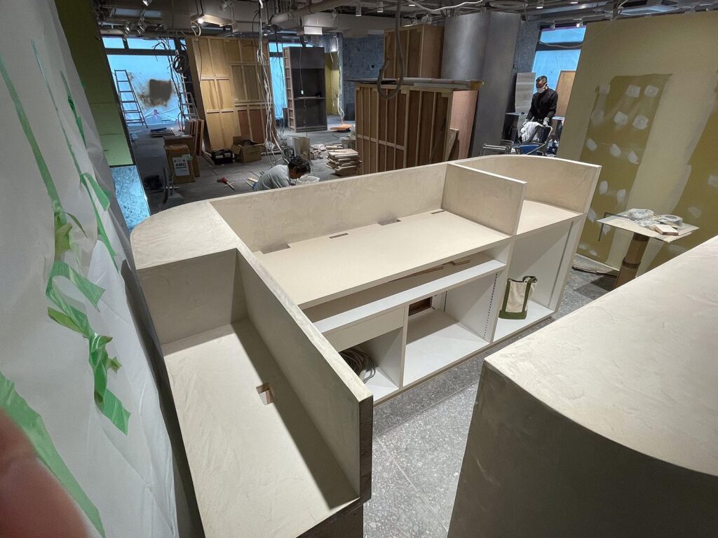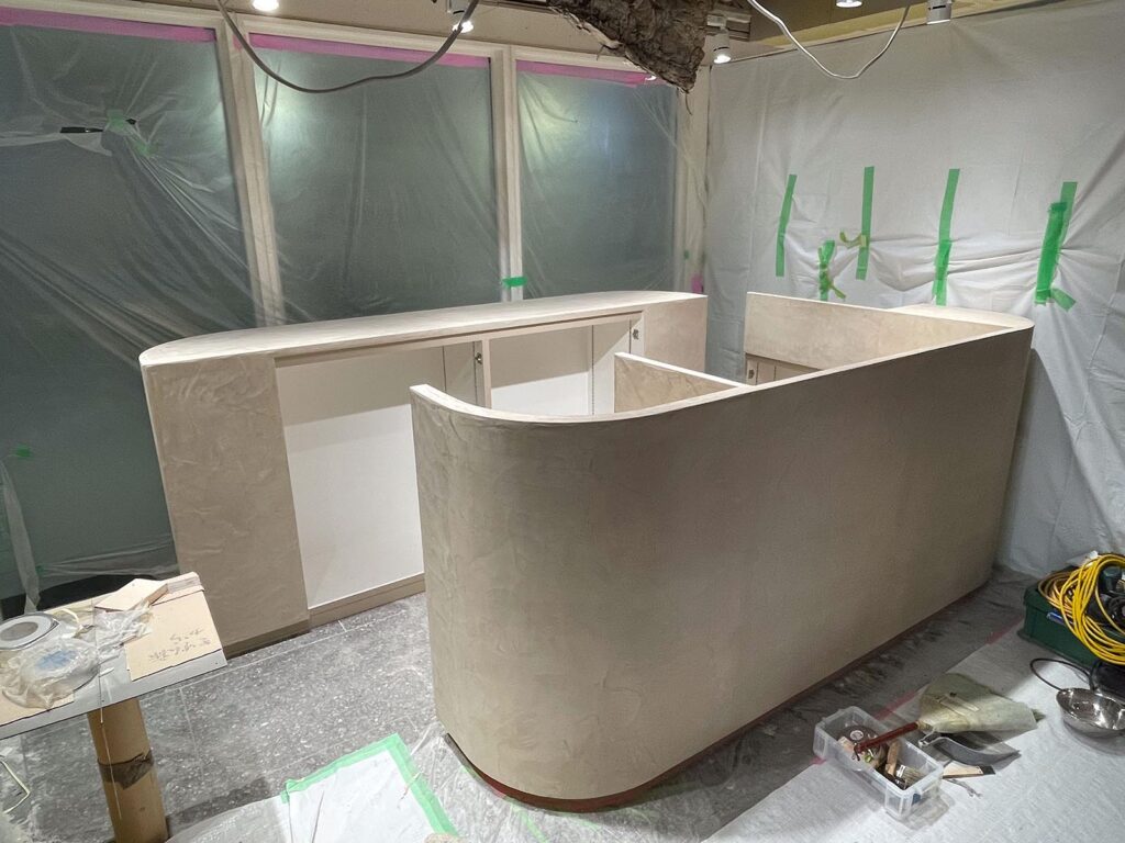 受付カウンターをモールテックスで施工させていただきました。アールだったり角が多くて苦労しましたが綺麗に仕上がりました。