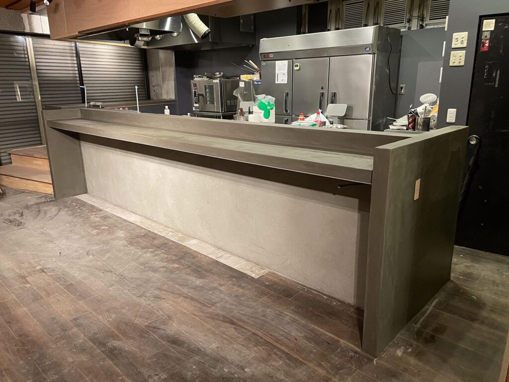純モルタルで仕上げた什器になります。セメント・砂の素材感がシンプルで落ち着いた什器になりました。