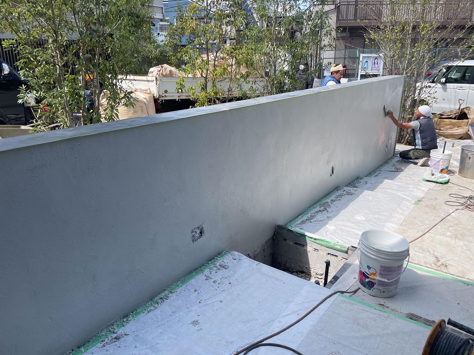 マンションの塀のガラスビーズ洗い出し工事。ガラスビーズに光が反射してキラキラして綺麗でした。