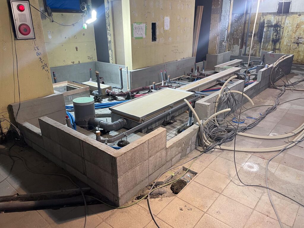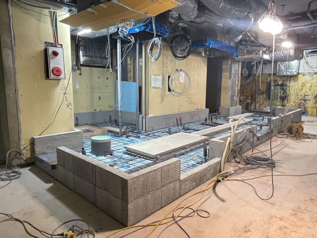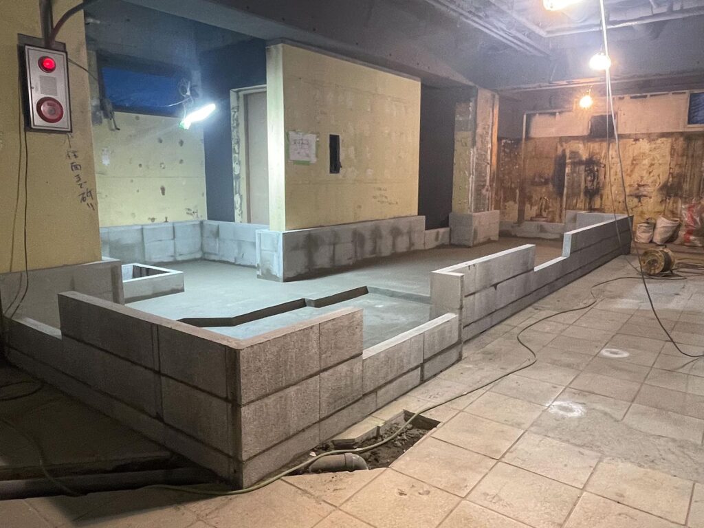 厨房工事。ブロックを積み、防水下地を塗り、防水・配管後スタイロを敷き重ねワイヤーメッシュを敷き生コンクリートを打設し仕上げました。依頼があればこんな仕事もします。