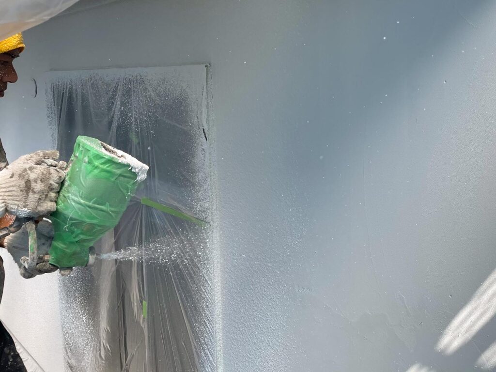 吹付仕上げです。小粒の玉で若干の凹凸もあり、フラット感もある仕上げです。吹付工事も請け負えます。